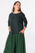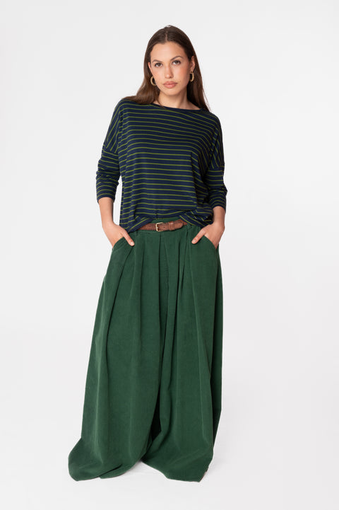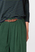 Il pantalone dal taglio ampio conpence eleganti in velluto a costa larga. L'elastico in vita garantisce una vestibilità perfetta, mentre i passanti permettono di aggiungere una cintura per un tocco personale. Le tasche pratiche completano questo capo.