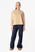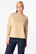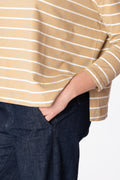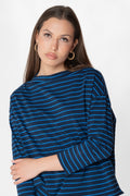 T shirt realizzata in cotone rigato 100% biologico. Taglio a scatoletta, scollo a barca, manica tre quarti e spacchi laterali.