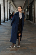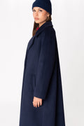 Cappotto lungo in morbido panno, caratterizzato da una chiusura laterale con bottone che aggiunge un tocco di originalità e stile.